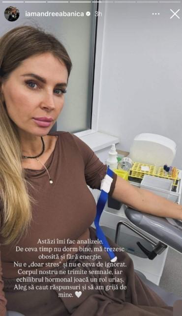 „Astăzi îmi fac analizele. De ceva timp nu dorm bine, mă trezesc obosită și fără energie. Nu e «doar stres» și nu e ceva de ignorat. Corpul nostru ne trimite semnale, iar echilibrul hormonal joacă un rol uriaș. Aleg să caut răspunsuri și să am grijă de mine”, a scris Andreea în timp ce și-a făcut un selfie pe scaunul de recoltare la analize.