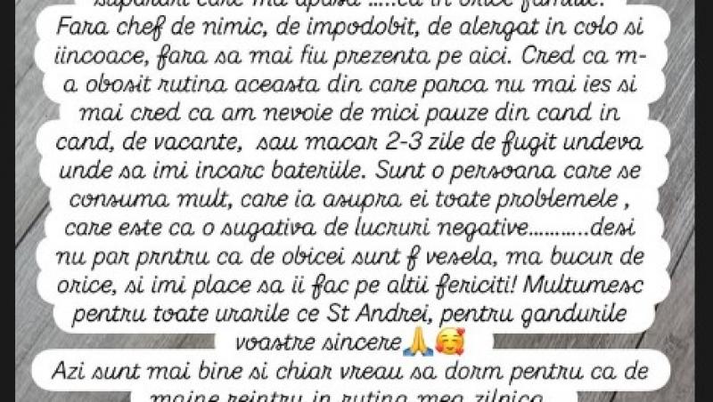 De asemenea, Andreea a vorbit despre oboseala pe care o resimte în aceste zile. Tocmai de aceea a decis să ia o pauză de la concerte sau mondenități: „Cred că pentru prima oară în viață mi-am luat o pauză de la tot ce aveam de făcut. (...) M-a ajuns oboseala pe care o resimt de ceva timp încoace. Pentru unii este un fel de anxietate, burnout... eu am simțit o tristețe cu doar mare de ai mei și cu ceva supărări care mă apasă...”