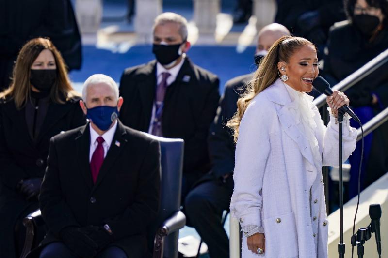 Îndrăgita artistă și-a făcut apariția la inaugurarea lui Joe Biden într-o ținută albă formată dintr-o pereche de pantaloni lungi până în pământ, albi, o bluză cu detalii din tule și un palton alb. Strălucirea este dată de bijuteriile pe care artista le poartă atât pe mâini, cât și la mijlocul taliei.