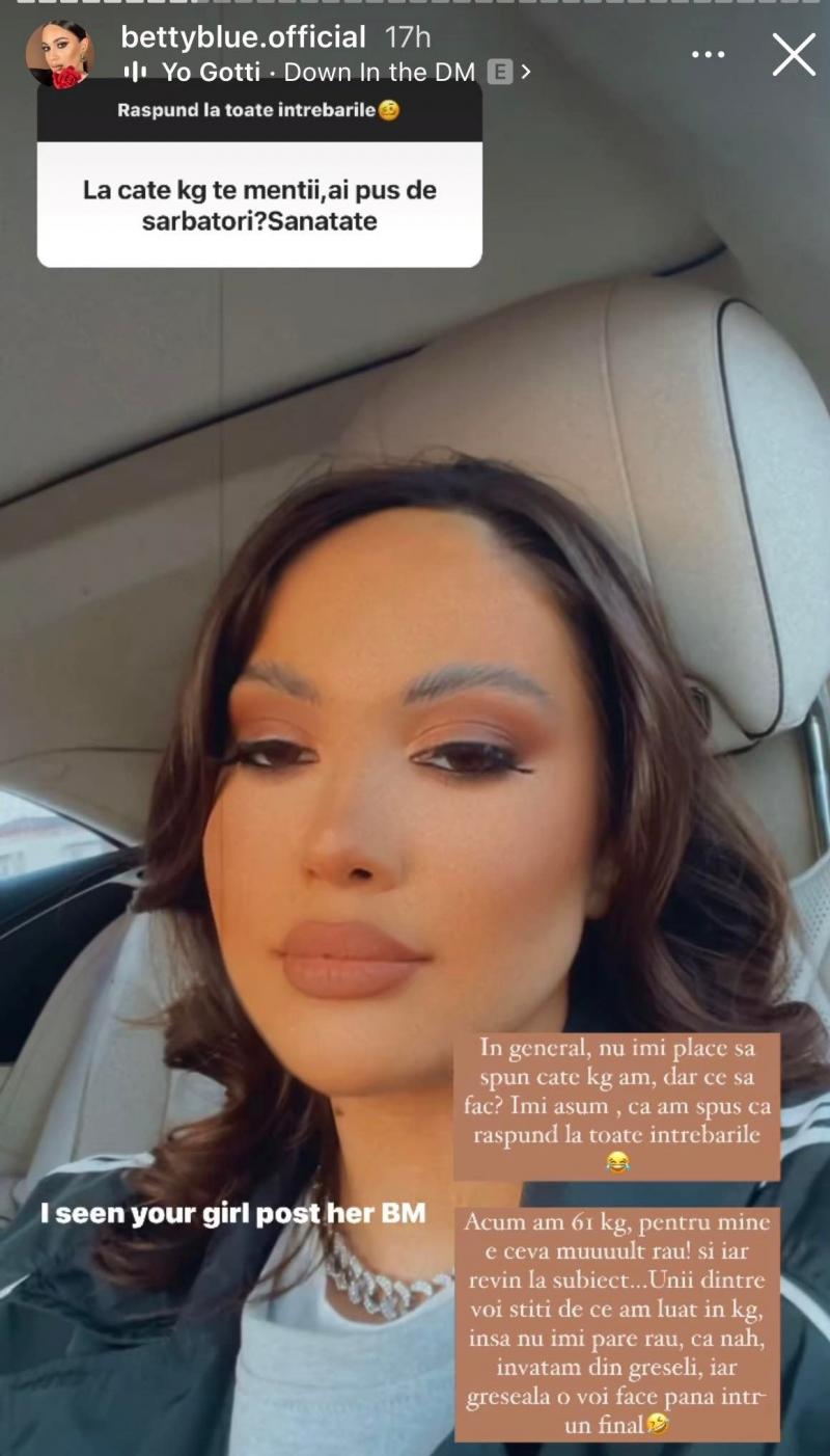 „În general nu-mi place să spun câte kilograme am, dar ce să fac? Îmi asum, am spus că răspund la toate întrebările. Acum am 61 de kilograme, iar pentru mine mult rău! Și revin la subiect... Unii dintre voi știți de ce am luat în kilograme, însă nu îmi pare rău, că nah, învățam din greșeli, iar greșeala o voi face până într-un final.”, a scris Betty Blue, vizibil amuzată de dezvăluirile sale.