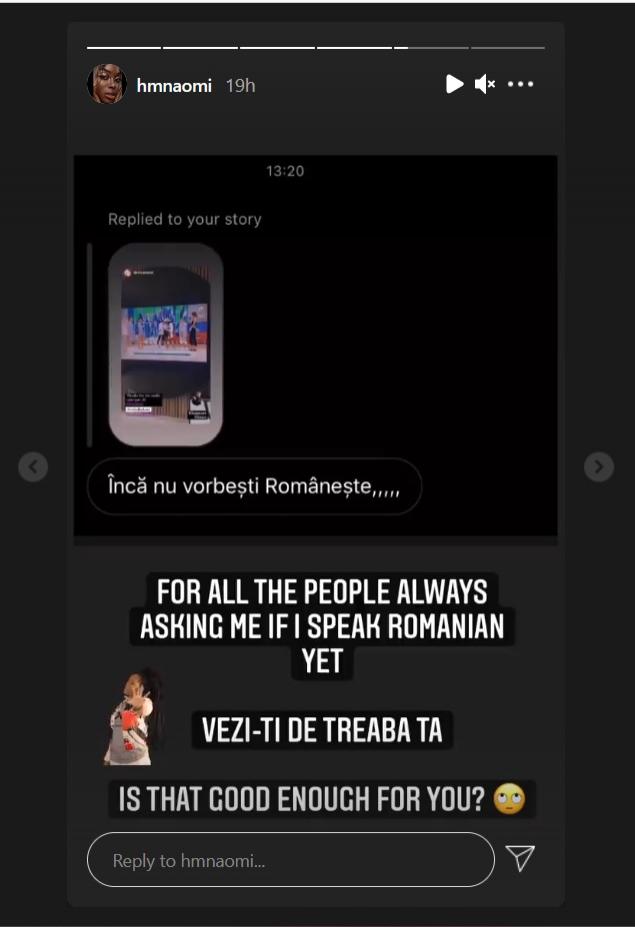 Naomi a vorbit la sfârșitul anului trecut despre procesul ei de învățare a limbii române și a dezvăluit că sunt multe cuvinte care o pun în dificultate, iar de curând se pare că acesta a fost obiectul unui reproș din partea unui fan nemulțumit.