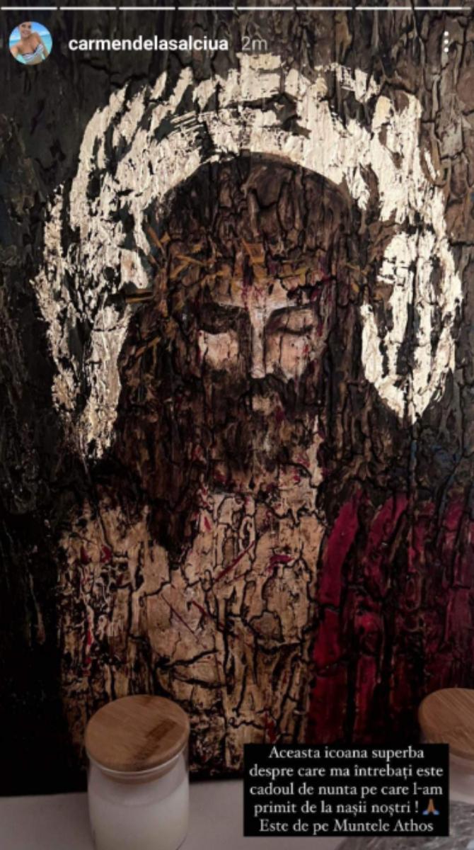 „Această icoană superbă despre care mă întrebați este cadoul de nuntă pe care l-am primit de la nașii noștri. Este de pe Muntele Athos”, a scris Carmen de la Sălciua pe InstaStory, potrivit sursei menționate mai sus.