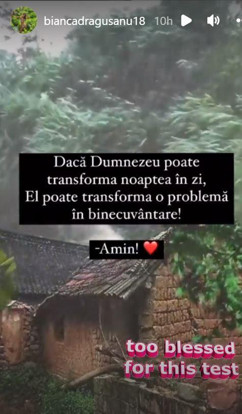 Dacă Dumnezeu poate transforma noaptea în zi, el poate transforma o problemă în binecuvântare. Amin”, a fost mesajul cu subînțeles pe care și-a dorit Bianca Drăgușanu să-l transmită urmăritorilor săi de pe rețelele sociale.
