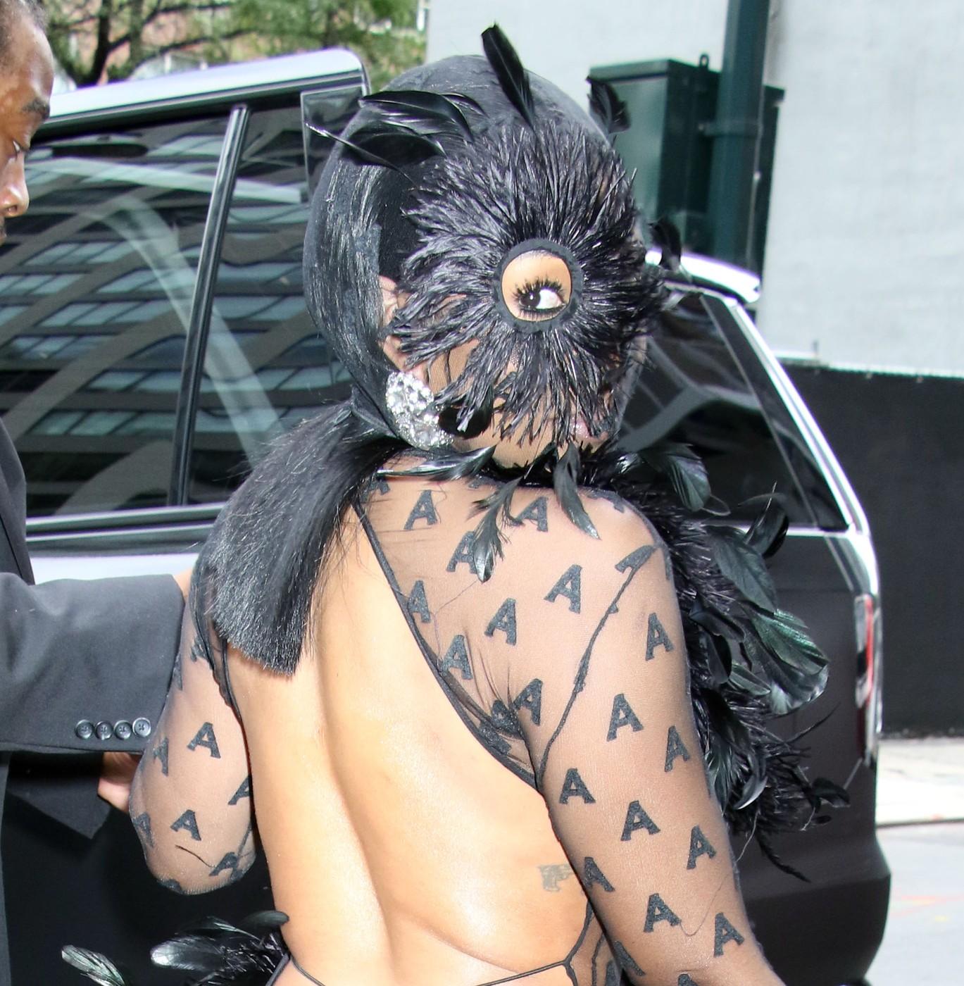 Ținuta bizară cu spatele gol este o creație a casei de modă AREA. Piesa vestimentară a avut litera A brodată pe întreaga suprafață. Mai mult, rochia a „obligat-o” pe Yung Miami să renunțe la sutien.