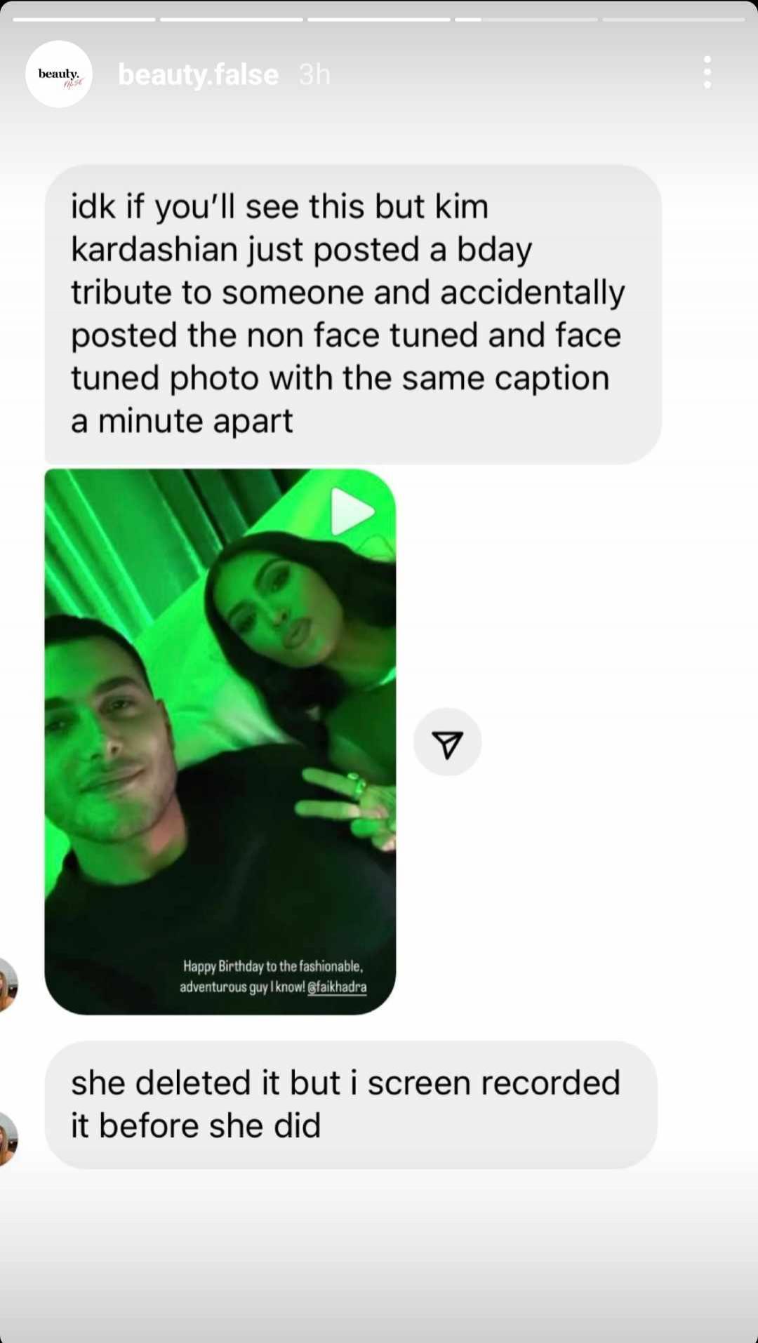 „Nu știu dacă o să vezi asta, dar Kim Kardashian tocmai a postat o urare pentru cineva și din greșeală, a distribuit poza fără filtru de înfrumusețare și poza cu filtru, folosind aceeași descriere, la un minut distanță”, a transmis un utilizator unui cont de pe Instagram celebru pentru că „demască” imaginea reală a vedetelor din întreaga lume.