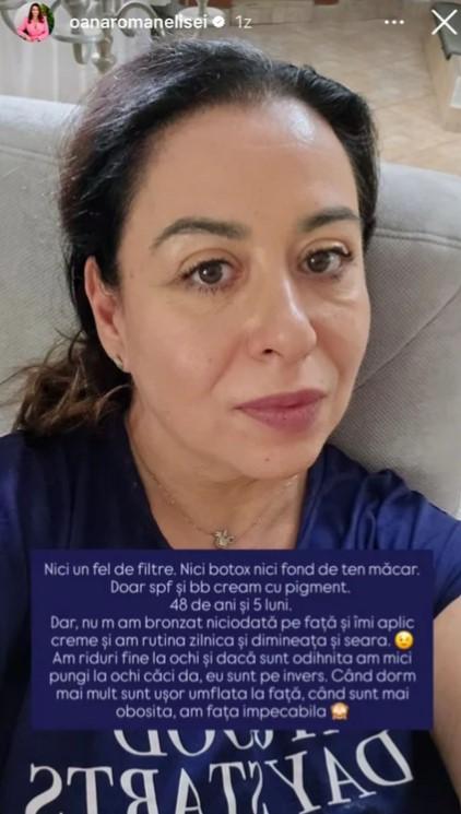 Însă, de această dată, Oana Roman a renunțat complet la fond de ten și la filtre pentru a le arăta fanilor și urmăritorilor ei cum arată chipul ei natural la vârsta de 48 ani.