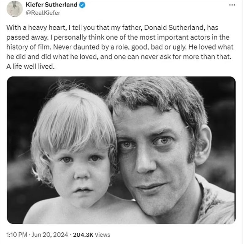 "Cu inima îndurerată vă anunț că tatăl meu, Donald Sutherland, a murit. Personal cred că am pierdut unul dintre cei mai mari actori din istoria filmului. Nu a dat niciodată înapoi de la orice fel de rol, bun, rău sau urât. A iubit ce a făcut și a făcut ce a iubit și nimeni nu poate cere pentru ceva mai mult. A trăit o viață împlinită", a scris Kiefer într-o postare pe X.