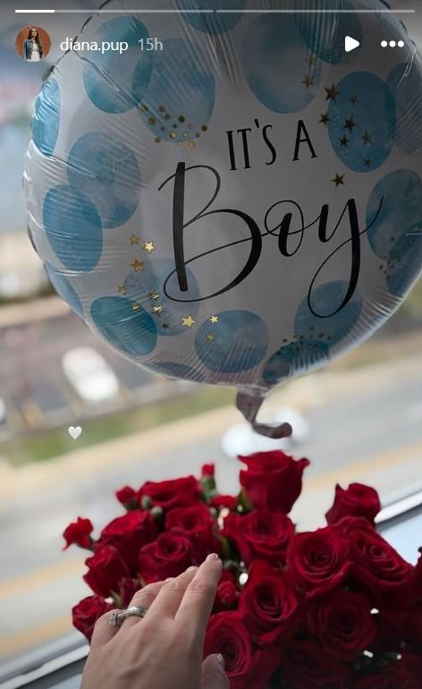 Diana Buble a postat și ea pe Insta Story o imagine cu un balon albastru pe care scrie “E băiețel” și un buchet mare de trandafiri roșii.