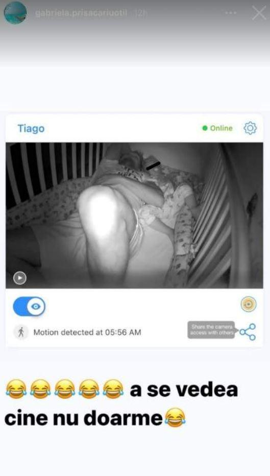 „A se vedea cine nu doarme”, a fost mesajul scris de soția acestuia alături de imaginea cu cei doi, văzută pe camera de supraveghere din dormitorul copilului.