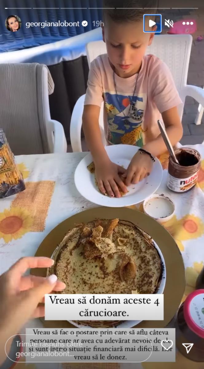 „Dragii mei, astăzi avem activitate! Sunt liberă, cu copiii, ne jucăm și păpăm clătite și am scos cărucioarele afară, pe care nu le mai folosim și vreau să le donez. Vreau să fac o postare. Donez cărucioarele copiilor, de care ne-am folosit tare bine. Acestea le foloseam când mergeam în călătorii pe avion și acestea le foloseam mai mult în viața de zi cu zi. Sunt foarte practice. Vreau să găsim niște cazuri la care sa le trimitem cărucioarele, la familii care sunt convinsă ca ar avea cu adevărat nevoie de ele.”, a mai completat Georgiana Lobonț pe Instagram, citată de Fanatik.