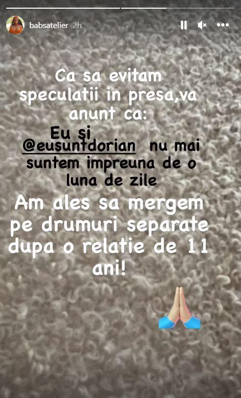 ”Ca să evităm speculații în presă, vă anunț că: Eu și @eusuntdorian nu mai suntem împreună de o lună de zile. Am ales să mergem pe drumuri separate după o relație de 11 ani”, a anunțat Claudia Iosif, aka Babs, pe Instagram.