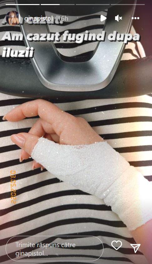 Postarea Ginei Pistol a atras toate privirile. Pentru a nu genera tot felul de speculații, vedeta a specificat că și-a luxat mâna după ce a căzut. Aceasta nu a oferit prea multe detalii despre accidentarea sa, însă a încercat să facă hz de necaz pe seama incidentului.