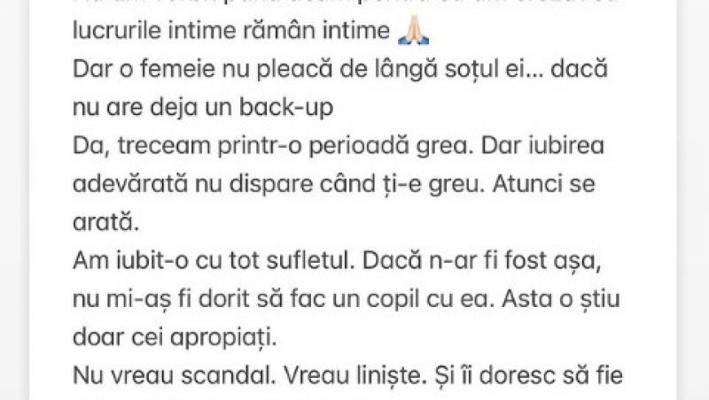 „Nu am vorbit până acum pentru că am crezut că lucrurile intime rămân intime. Dar o femeie nu pleacă de lângă soțul ei dacă nu are deja un back-up. Da, treceam printr-o perioadă grea. Dar iubirea adevărată nu dispare când ți-e greu. Atunci se arată. Am iubit-o cu tot sufletul. Dacă n-ar fi fost așa, nu mi-aș fi dorit să fac un copil cu ea. Asta o știu doar cei apropiați. Nu vreau scandal. Vreau liniște. Și îi doresc să fie fericită. Atât am avut de spus”, a fost mesajul lui Lino Golden, transmis pe contul personal de Instagram.