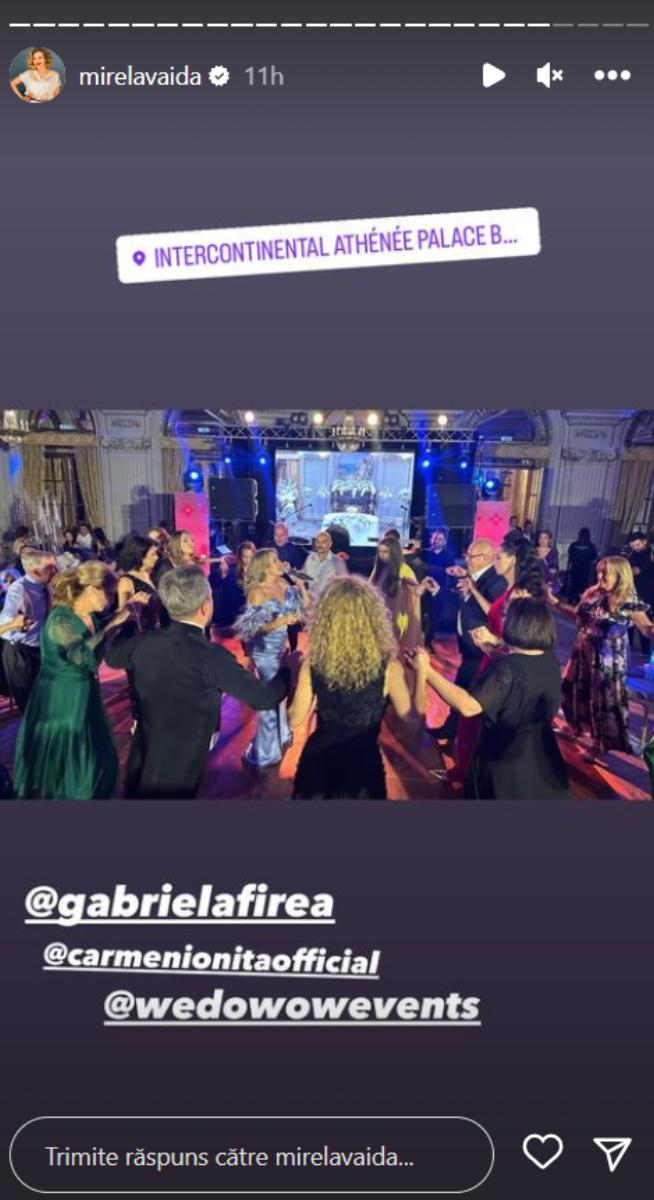 Mirela Vaida s-a numărat și ea printre nuntași, care nu doar că a participat la evenimentul important, dar a și cântat și întreținut atmosfera, potrivit imaginilor publicate de prezentatoare Acces Direct pe contul personal de Instagram, la secțiunea Instastory.