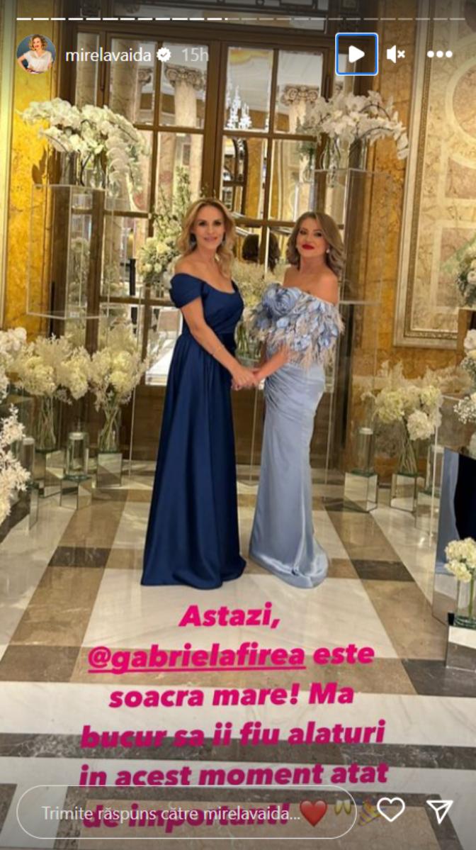 „Astăzi, Gabriela Firea este soacră mare! Mă bucur să îi fiu alături în acest moment atât de important! Felicitări”, a scris Mirela Vaida pe contul personal de Instagram, la secțiunea Instastory.