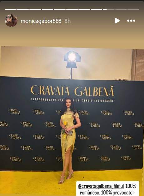 Monica Gabor, apariție surpriză în România. Ce ținută spectaculoasă a purtat la premiera filmului „Cravata galbenă”