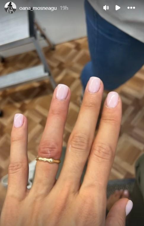 În cabina de machiaj, Oana s-a filmat în oglindă și a povestit pe Insta Story că uitase că trebuie să își scoată verigheta de pe deget pentru că așa îi cere personajul ei din serial.