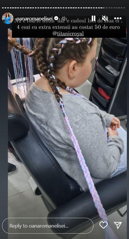 Ajunsă acolo, Oana Roman și-a ținut fanii la curent cu întreaga sa activitate și le-a arătat internauților cum o răsfață pe Isa de ziua ei. Cele două s-au trezit dis de dimineață azi și au mers la coafor, acolo unde Isabela s-a bucurat de un nou look. Fetița și-a împletit codițe colorate.