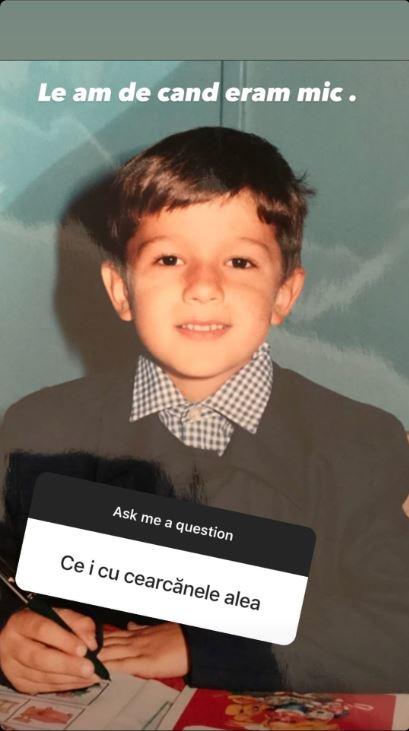 Oricât de amuzantă ar fi întrebarea, Vlad a deci să răspundă cu o fotografie de când era elev, spunând că a avut cearcănele dintotdeauna, încă de când era doar un puști. Fotografia cu el din copilărie le-a atras atenția fanilor.