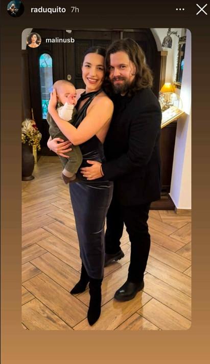 Toți trei apar extrem de eleganți, Radu poartă un costum negru, Mădălina o rochie neagră din catifea și botine negre cu toc, iar fiul lor este îmbrăcat într-o salopetă verde și o bluziță albă. Mădălina îl ține în brațe pe băiețelul lor, iar Radu o ține de mijloc pe Mădălina, fiind foarte protectiv cu familia sa.