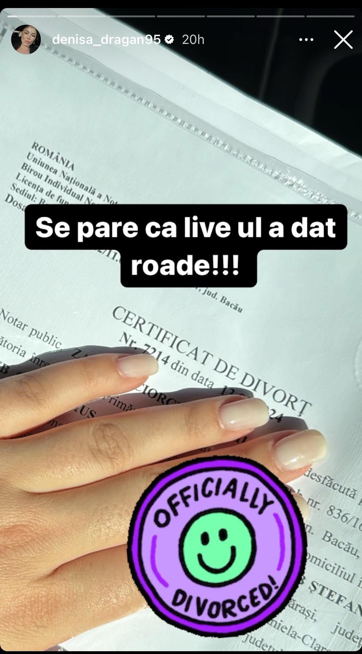 Totuși, se pare că lucrurile s-au calmat, dat fiind faptul că Denisa s-a postat în mediul online în ipostaza de „femeie liberă” împărtășind cu internauții imagini cu certificatul de divorț pe care l-a obținut, chiar ieri, 13 mai 2024.