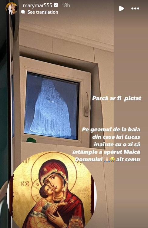 Alina Marymar a postat pe Insta Story că înainte cu o zi ca Lucas să se stingă, se pare că a apărut un semn în casa nepotului lui Tzanca Uraganul. Pe geamul de la baie a apărut o siluetă care arăta ca o icoană cu Sfânta Fecioară.