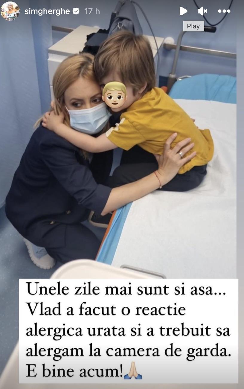 „Unele zile mai sunt și așa. Vlad a făcut o reacție alergică urâtă și a trebuit să alergăm la camera de gardă. E bine acum”, a scris Simona Gherghe, pe Instagram.
