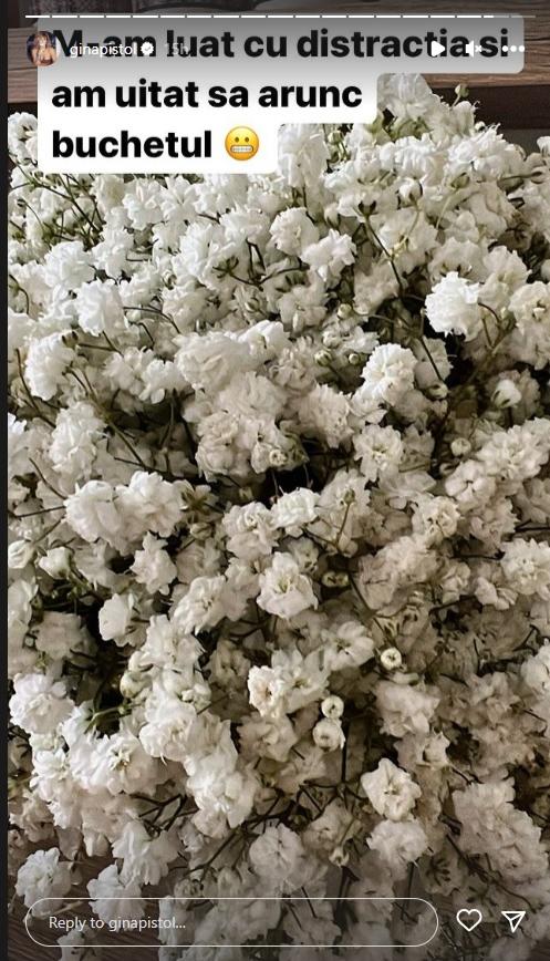 La 3 zile de la nuntă, Gina Pistol a publicat o fotografie cu buchetul de mireasă, precizând că a uitat de tradiția aruncatului buchetului de la finalul nunții. „M-am luat cu distracția și am uitat să arunc buchetul”, a scris Gina Pistol în dreptul buchetului de flori albe.