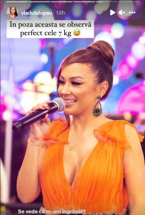 Artista cântărește în prezent 56.8 kilograme și nu-i convine prea bine, ea ar vrea să mai dea jos puțin. „După cum puteți observa eu intru la dietă și alții nu, pentru că m-am îngrășat așa, cam 7 kilograme și asta doar datorită lu' soacră-mea. Merci, Zoe!”, spune Vlăduța Lupău într-un clip pe Instagram, unde se afla la restaurant alături de soacra ei.