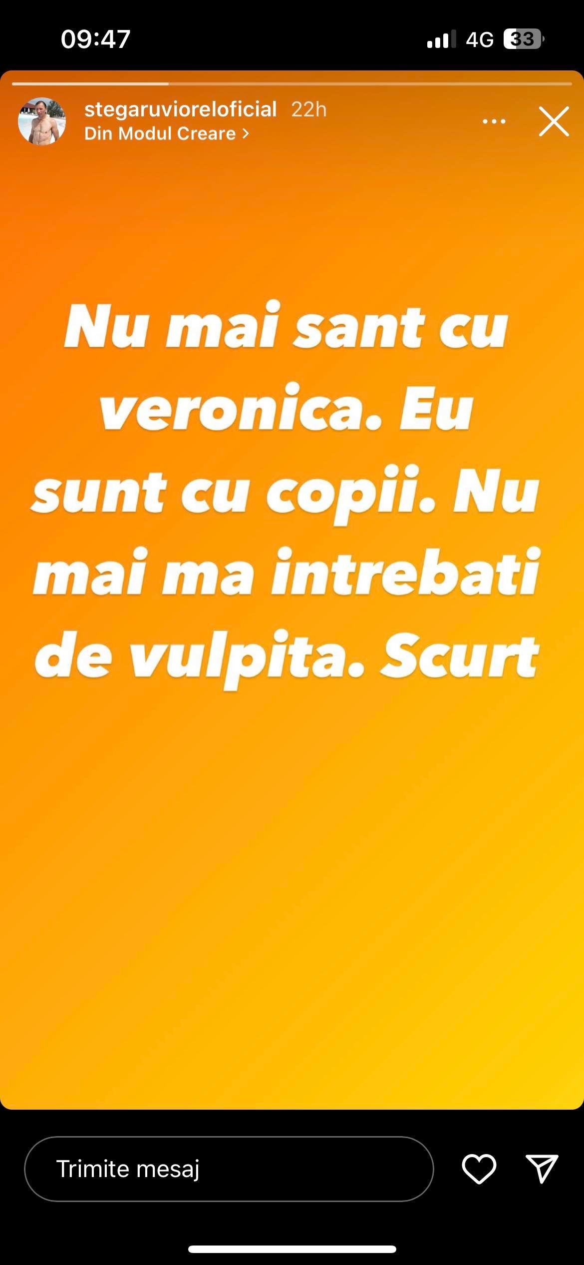 „Nu mai sunt cu Veronica. Eu sunt cu copiii. Nu mă mai întrebați de Vulpița. Scurt”, a scris el pe Instagram, în modul său propriu.